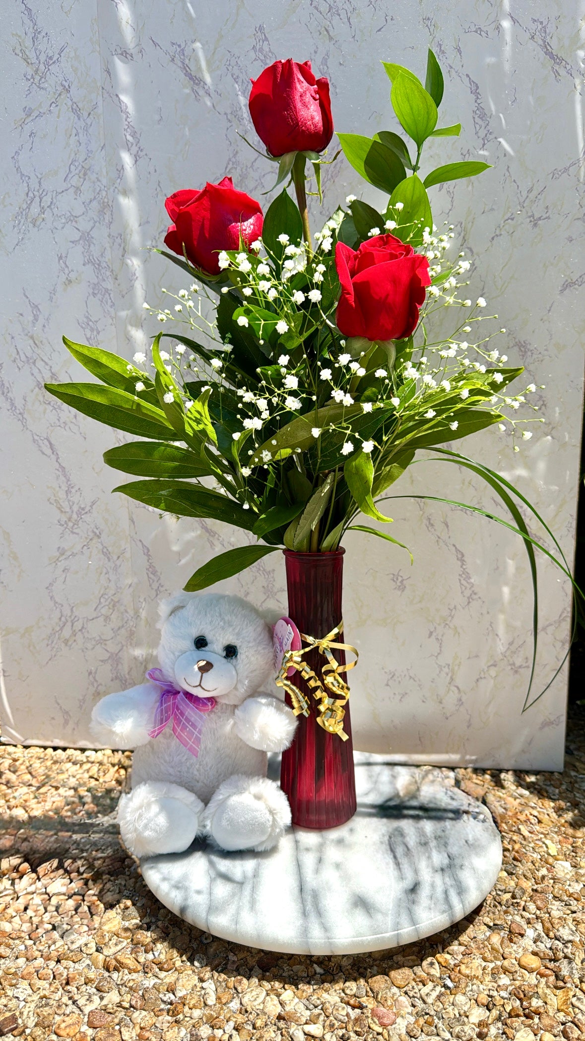 Elegant Simplicity. Add a touch of elegance to any room with our 3 rose bud vase with a lovely plush bear. This is the perfect sweet surprise or thoughtful gift. Our freshest long lasting long stem roses are carefully selected for their beauty and fragrance. This arrangement is perfect for any occasion, from romantic gestures to everyday beauty.